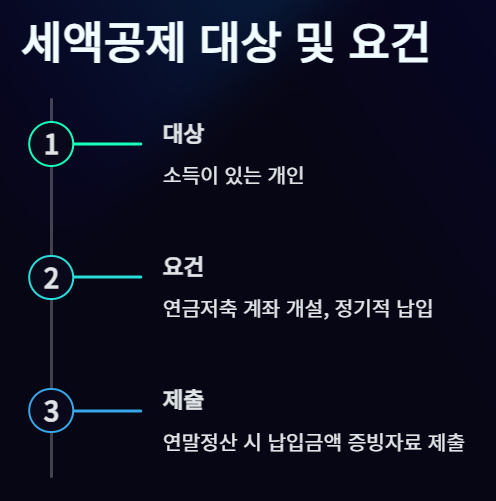 연금저축 세액공제는 근로소득자와 사업소득자를 포함해 소득이 있는 개인이라면 누구나 받을 수 있는 혜택입니다. 공제를 받으려면 연금저축 계좌를 개설하고 정기적으로 납입해야 하며, 연말정산 시 납입금액을 증빙자료로 제출해야 합니다.