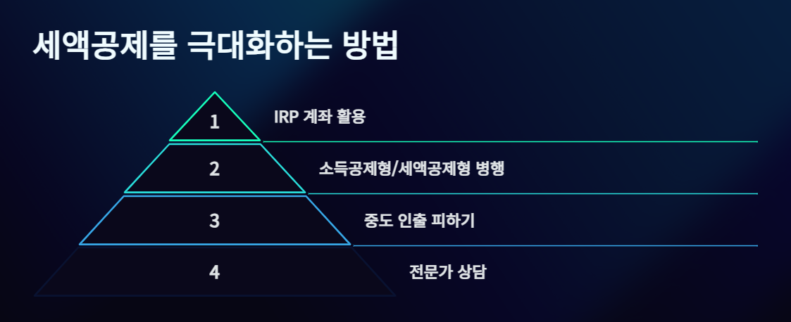 세액공제 혜택을 최대화하려면 매년 연금저축 공제 한도를 충분히 활용하는 것이 기본입니다. 여기에 IRP 계좌를 추가로 개설해 공제 한도를 확대할 수 있습니다. 또한, 소득공제형 상품과 세액공제형 상품을 병행 활용하면 절세 효과를 한층 더 높일 수 있습니다.