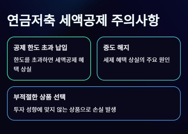 연금저축을 활용할 때 흔히 저지르는 실수 중 하나는 공제 한도를 초과해 납입하거나, 중도 해지를 통해 세제 혜택을 상실하는 것입니다.