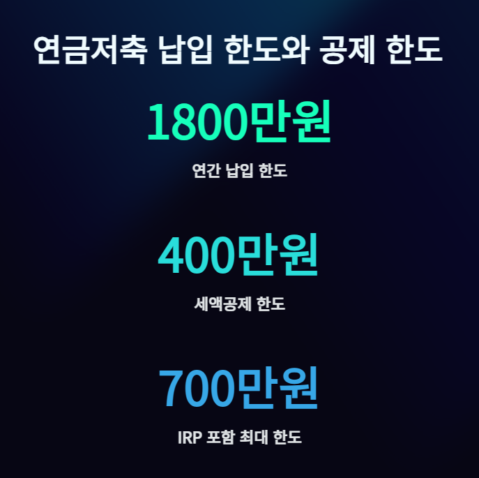 연금저축은 연간 납입 한도가 1,800만 원이며, 이 중 세액공제를 받을 수 있는 한도는 400만 원입니다. 단, 개인형 퇴직연금(IRP) 계좌를 함께 활용하면 공제 한도를 최대 700만 원까지 늘릴 수 있습니다.