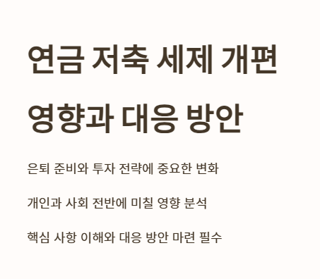 연금 저축 세제 개편은 국민의 은퇴 준비와 개인의 투자 전략에 중요한 변화를 가져올 수 있는 사안으로, 이를 이해하고 대응 방안을 마련하는 것이 필수적입니다. 이번 개편안의 핵심 사항을 살펴보고, 개인과 사회 전반에 미칠 영향을 구체적으로 분석하겠습니다.