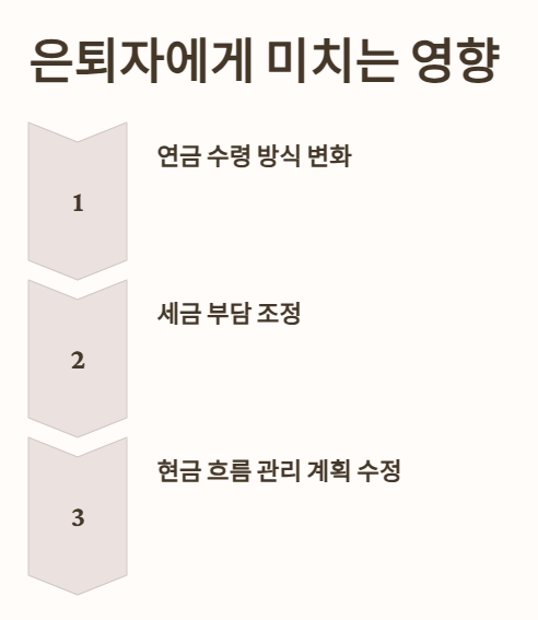 이번 개편은 은퇴 이후 연금 수령 방식과 세금 부담에 직접적인 영향을 미칩니다. 은퇴자들은 매달 받을 연금의 순수익이 늘어나거나 줄어들 가능성에 대비해 현금 흐름 관리 계획을 수정해야 할 필요가 있습니다.