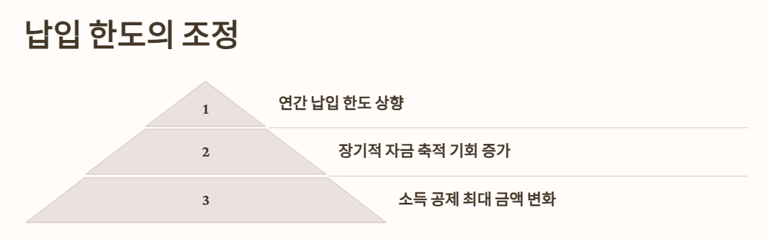 그러나 납입 한도가 증가하면서 소득 공제를 받을 수 있는 최대 금액도 비례하여 변화할 수 있습니다. 따라서 본인이 받게 될 세제 혜택을 정확히 분석하고, 최적의 납입 전략을 수립하는 것이 중요합니다. 특히, 고소득층은 추가 납입 여력이 있어도 소득 공제 한도를 초과하지 않도록 주의해야 합니다.