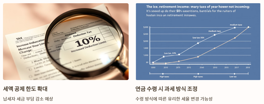 이번 세제 개편의 핵심 변화 중 하나는 연금 저축 세액 공제 한도의 확대입니다. 기존보다 공제 가능한 금액이 늘어남에 따라, 납세자의 세금 부담이 감소할 것으로 보입니다. 특히 세율이 낮아 세제 혜택의 폭이 상대적으로 제한적이었던 저소득층에게도 긍정적인 영향을 미칠 전망입니다.