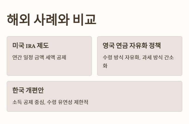 미국에서는 개인이 연간 일정 금액까지 세액 공제를 받을 수 있는 IRA 제도를 통해 은퇴 준비를 지원합니다. 영국은 연금 수령 방식의 자유화를 통해 개인의 선택권을 확대하면서도 연금의 과세 방식을 간소화하여 국민 부담을 줄였습니다. 이러한 사례와 비교하면, 한국의 개편안은 소득 공제 중심의 혜택을 제공하되, 수령 시점에서의 유연성은 아직 제한적인 모습을 보입니다.